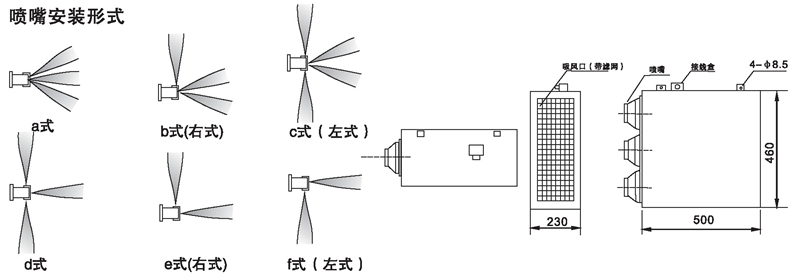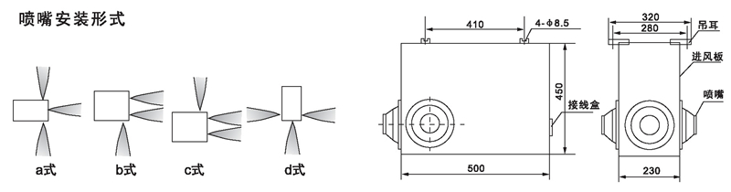 球形噴口立式誘導(dǎo)風(fēng)機(jī)由離心式通風(fēng)機(jī)、消聲機(jī)箱、三個(gè)萬(wàn)向球形噴嘴組成,回轉(zhuǎn)角度<60* ,噴口φ80X3;