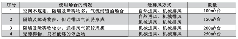 所需誘導(dǎo)風(fēng)機(jī)的臺(tái)數(shù),在考慮通風(fēng)方式(機(jī)械送排風(fēng),自然進(jìn)風(fēng)機(jī)械排風(fēng)),有無(wú)隔墻,空間形狀的前提下,技每臺(tái)誘導(dǎo)風(fēng)機(jī)所要承擔(dān)的面積計(jì)算,可參照下表確定:
